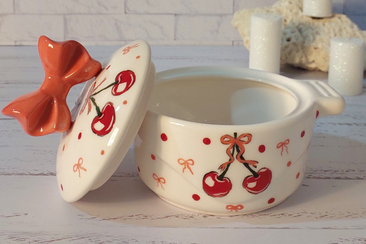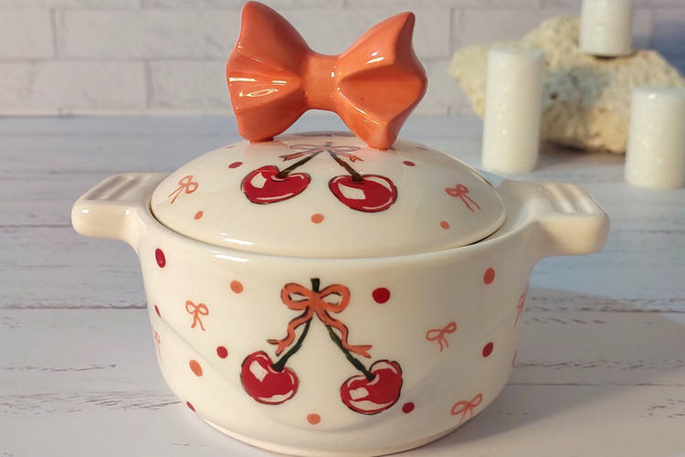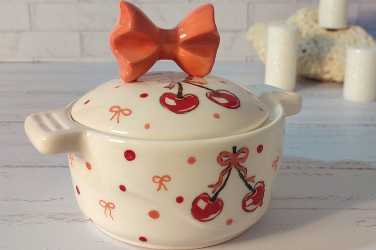 قابلمه سرامیکی دست ساز طرح عروسکی گیلاس و پاپیون