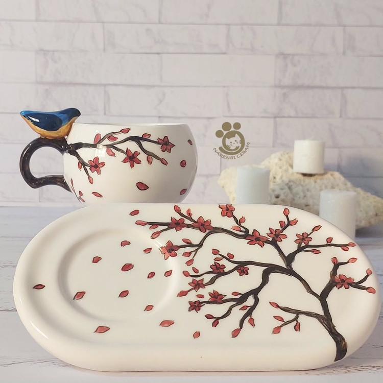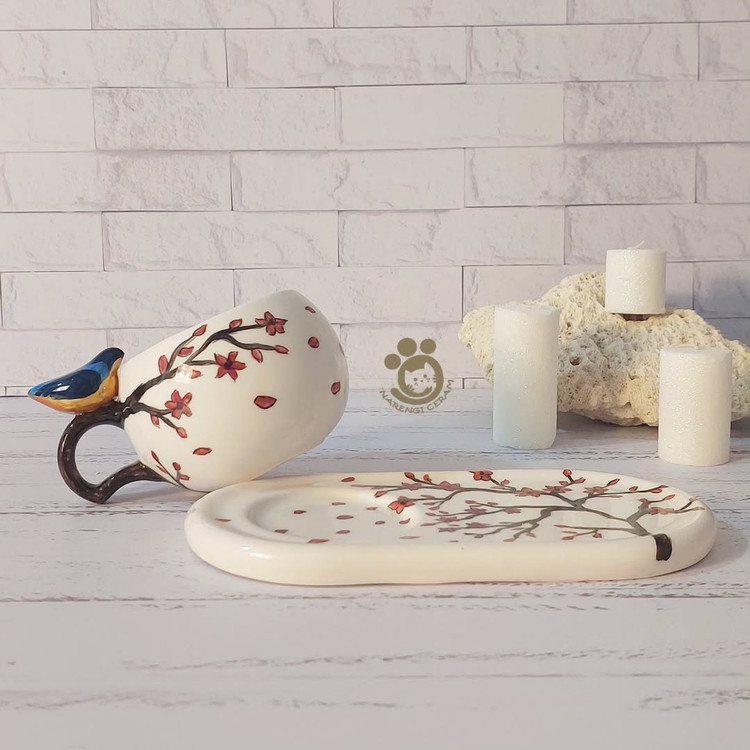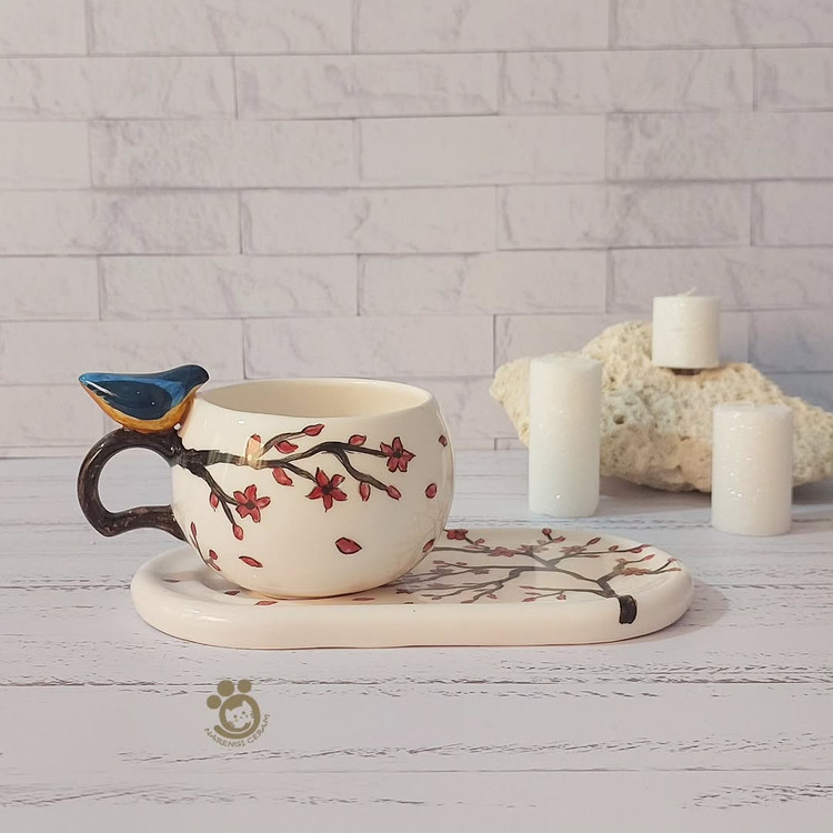 ست ماگ و زیر ماگی سرامیکی دست ساز طرح پرنده و شکوفه های گیلاس