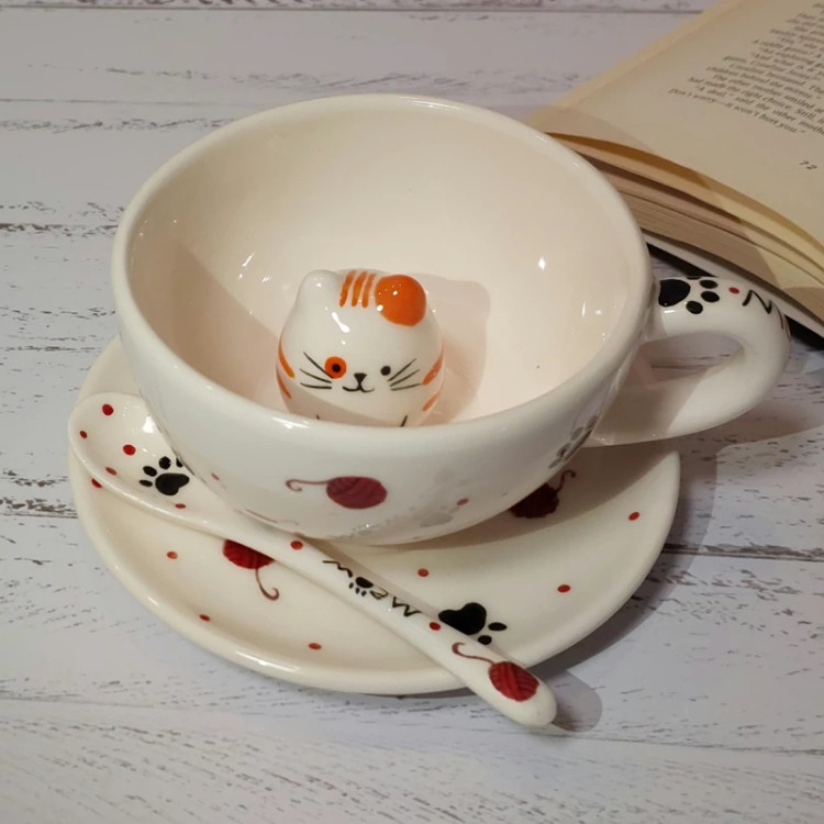 ی فنجون لته خوری با گربه داخل فنجون و زیر فنجونی و یک قاشق به عنوان هدیه از طرف نارنگی سرام برای شما دوست خوبم