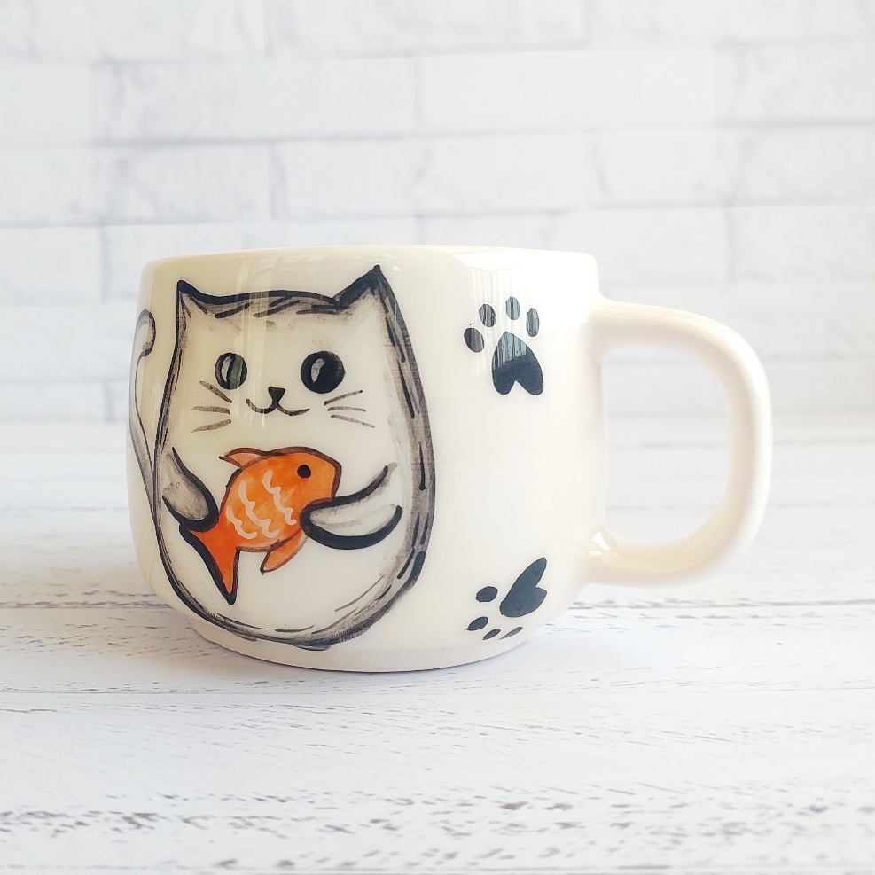 ماگ طرح گربه و ماهی دستساز سرامیکی نارنگی سرام