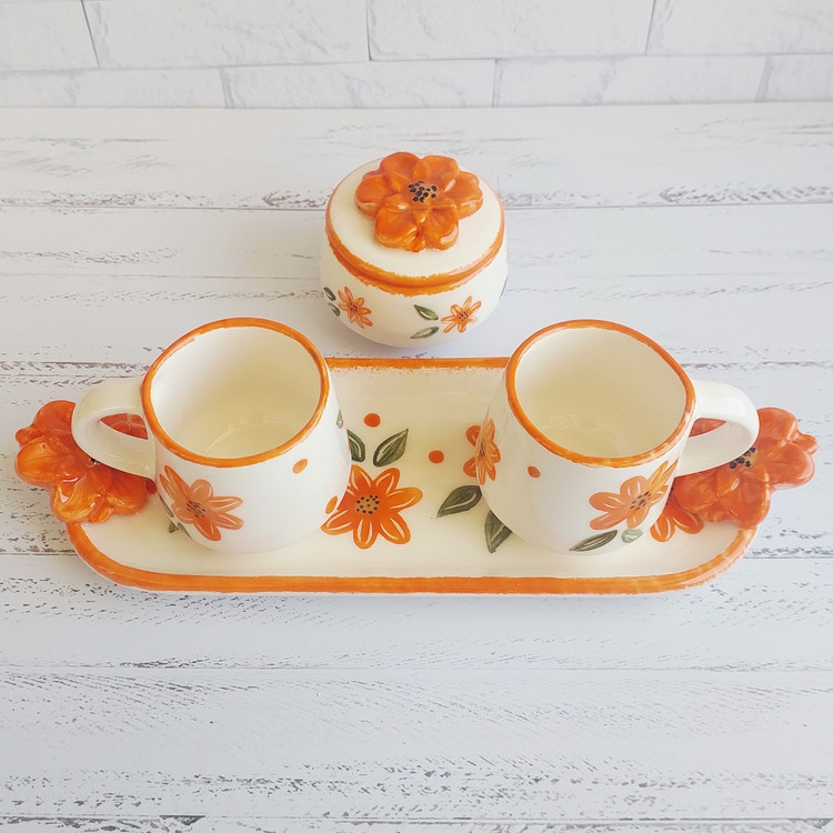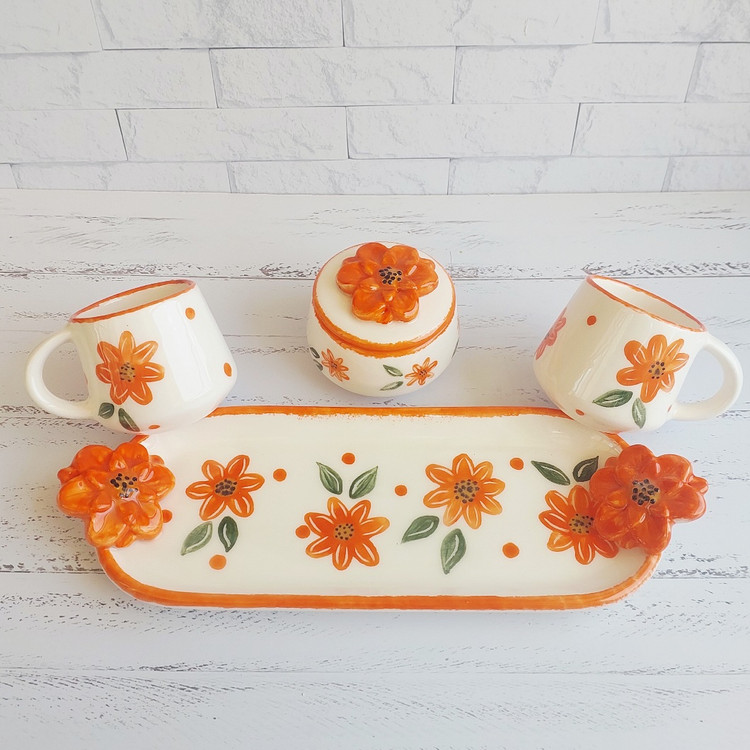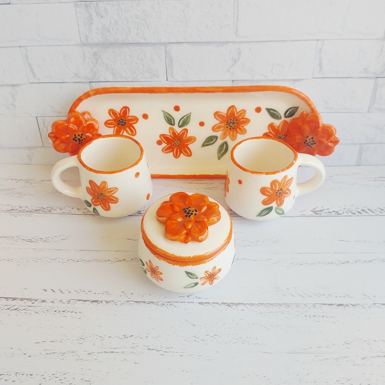 ست چای خوری سرامیکی دو نفره دست ساز طرح گل نارنجی